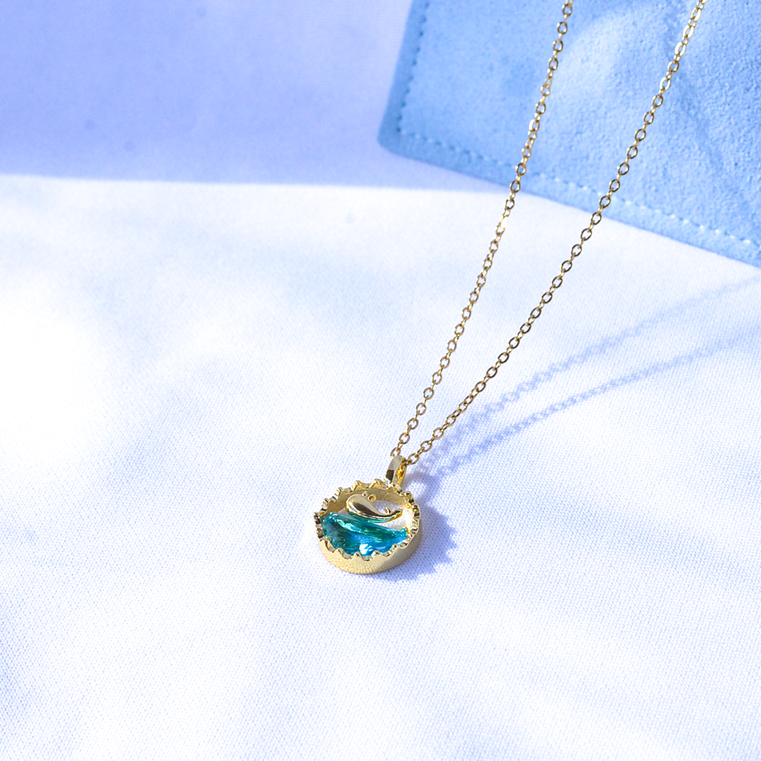 Adicione um toque de magia oceânica ao seu visual com o Colar Encanto Aquático da Azul Celeste. Este colar combina a elegância do dourado com a beleza serena de uma baleia nadando em uma onda de resina azul.